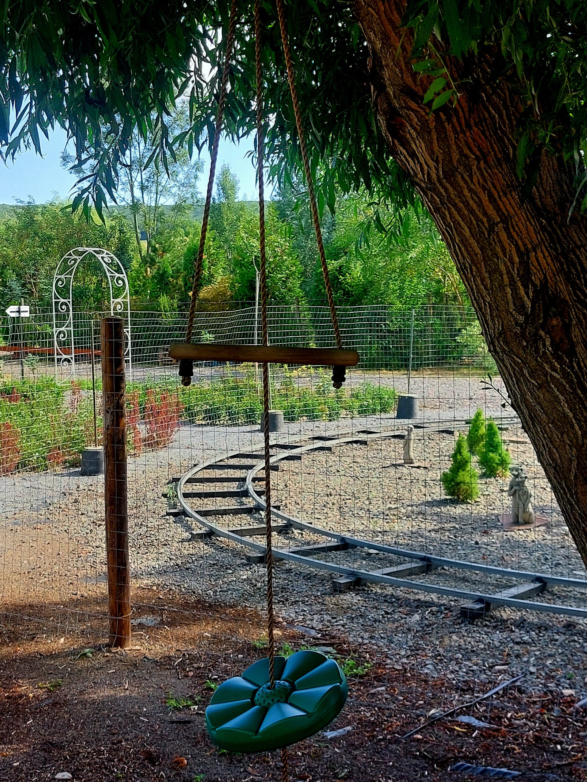Relaxați-vă și bucurați-vă de liniștea naturii în timp ce copiii se leagănă sub copacul umbros. Leagănul nostru suspendat este un loc minunat pentru momente de calm și visare.